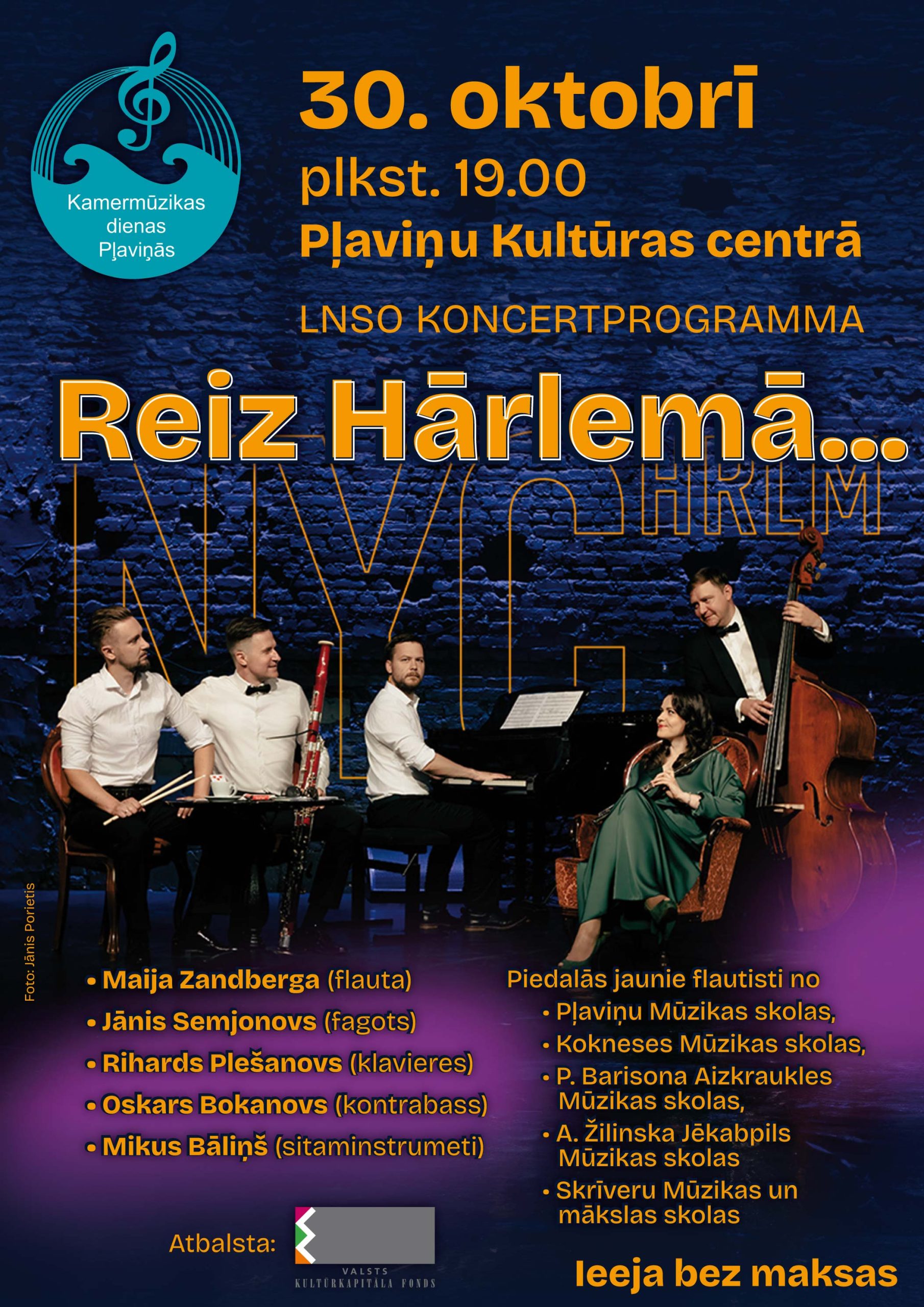 30. oktobrī ar aizraujošu muzikālu ceļojumu – akadēmiskās mūzikas satikšanos ar džeza un izklaides mūziku LNSO koncertprogrammā “Reiz Hārlemā…” noslēgsies 13. Pļaviņu Mūzikas skolas organizētās Kamermūzikas dienas. Kamermūzikas dienām cītīgi gatavojas Aizkraukles novada mūzikas skolas un Arvīdas Žilinska Jēkabpils Mūzikas skolas jaunie flautisti! Nāc un ļaujies kamermūzikas burvībai!