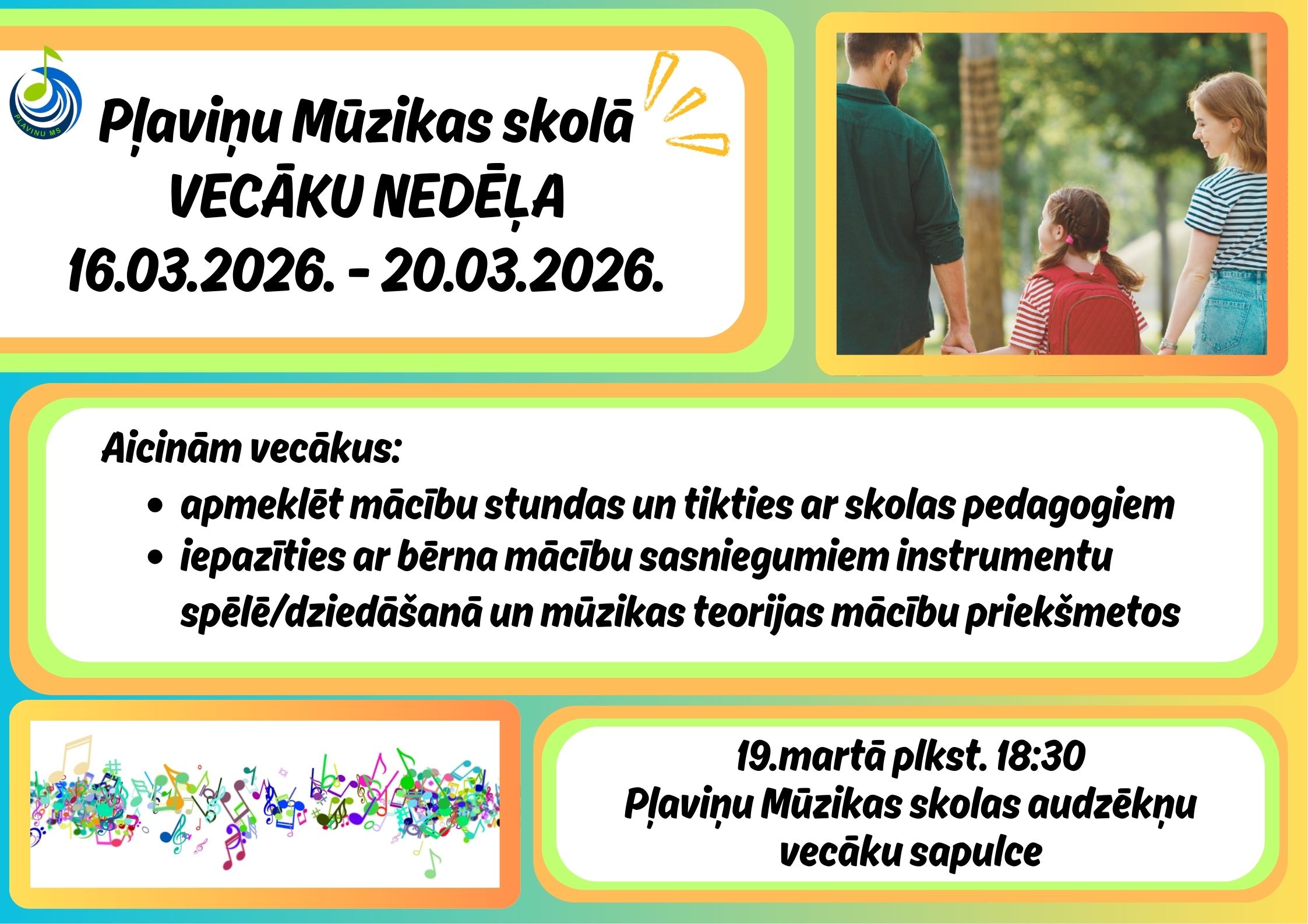 Aicinām apmeklēt mācību stundas, lai klātienē redzētu, kā norit darbs klasē, kā tiek apgūtas muzikālās prasmes un cik daudz ieguldījuma prasa katrs mazais un lielais sasniegums. Tā ir lieliska iespēja pārliecināties par bērnu izaugsmi, centību un radošo attīstību. Vecāku nedēļas ietvaros būs iespēja arī tikties ar skolas pedagogiem, pārrunāt bērna sekmes, mācību procesu, motivāciju un turpmākos mērķus.